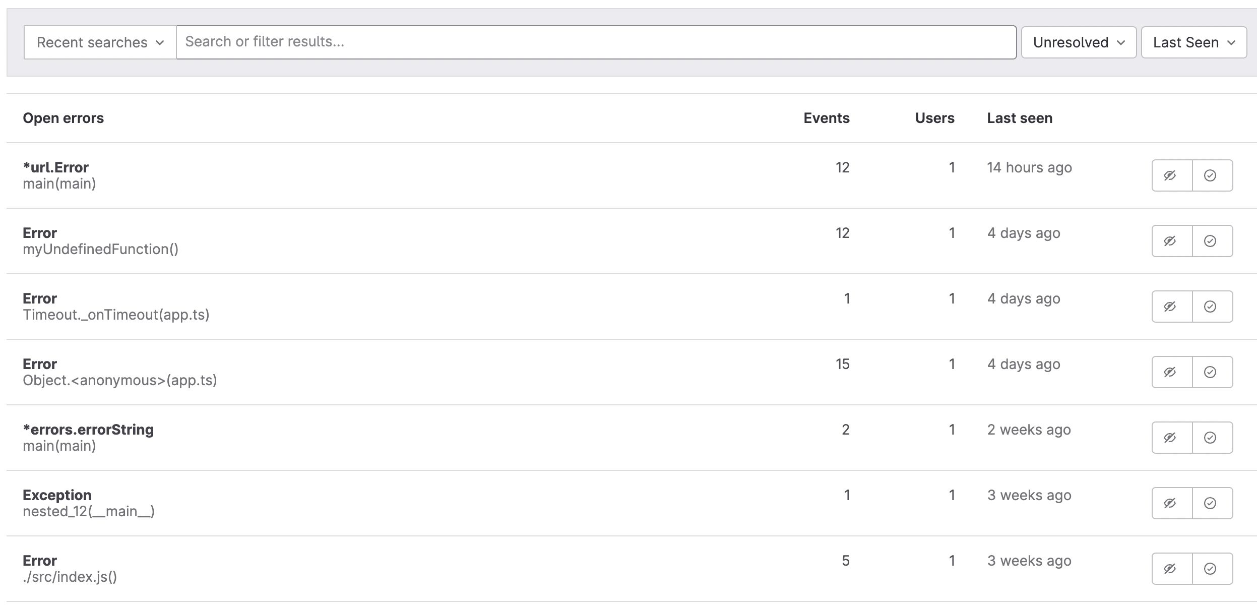 2. Go to Monitor > Error Tracking to see the list of open errors: